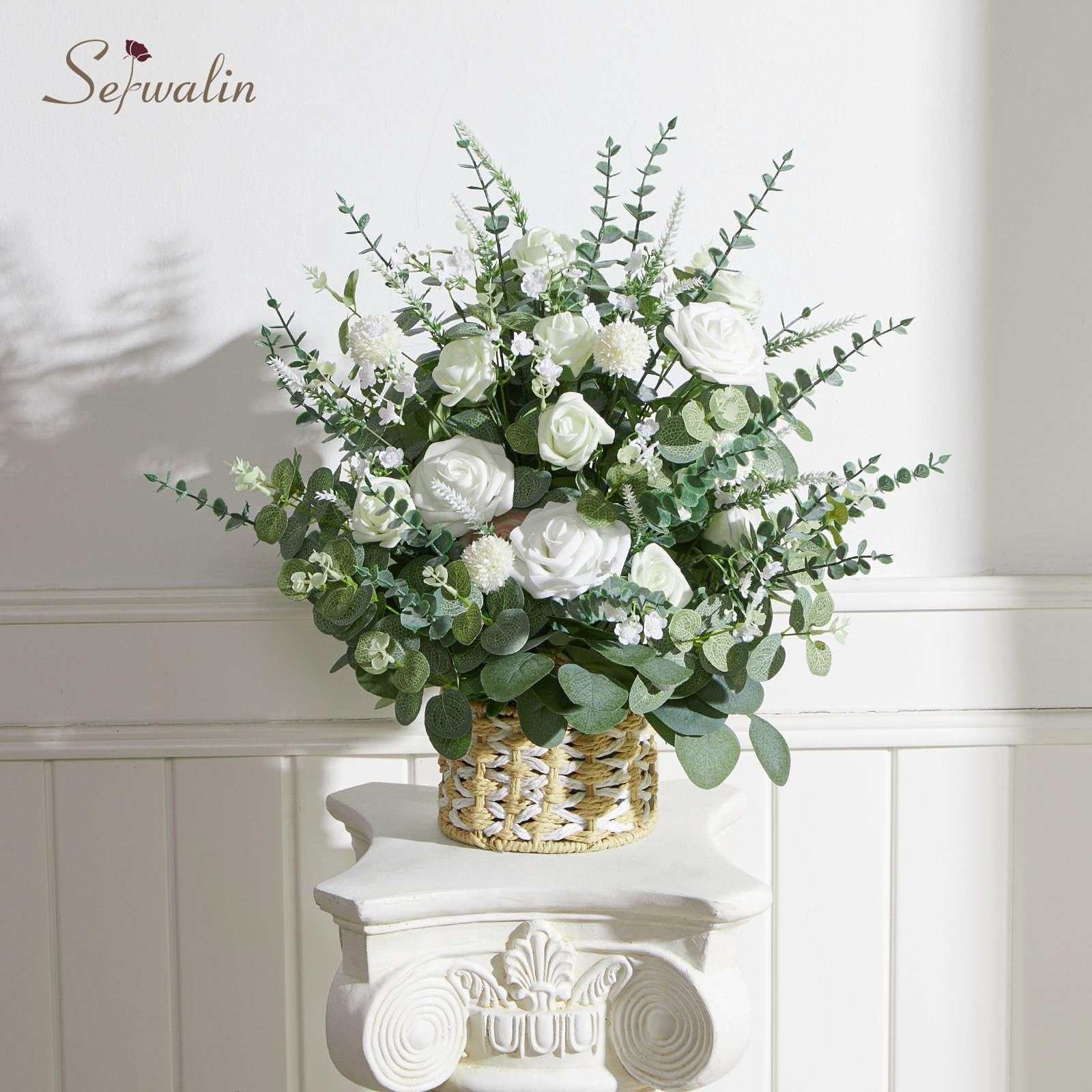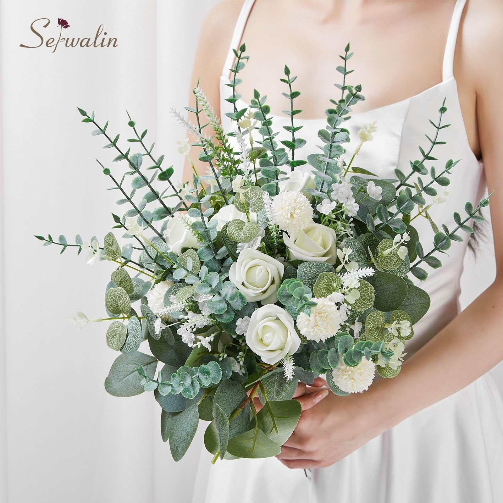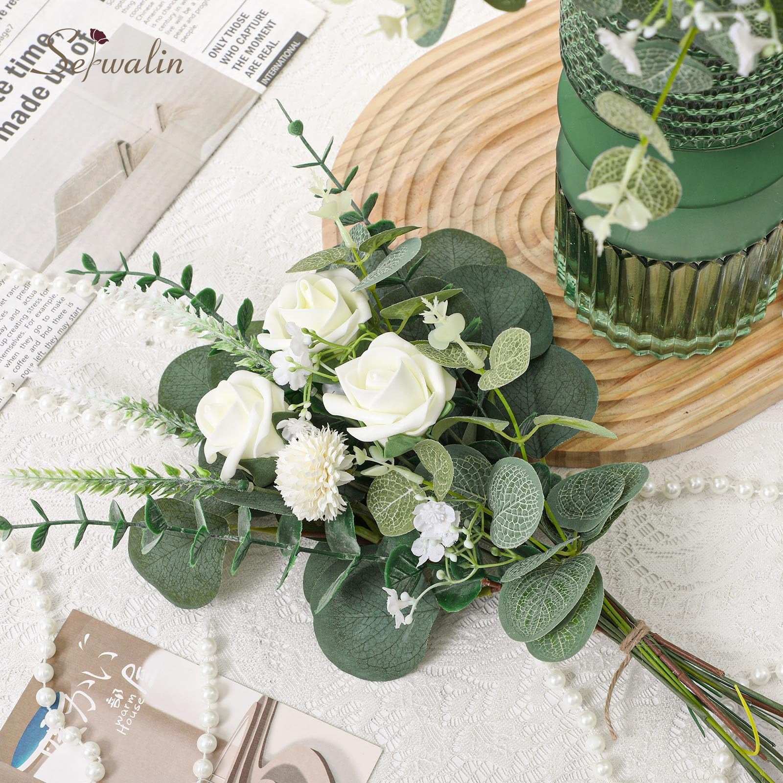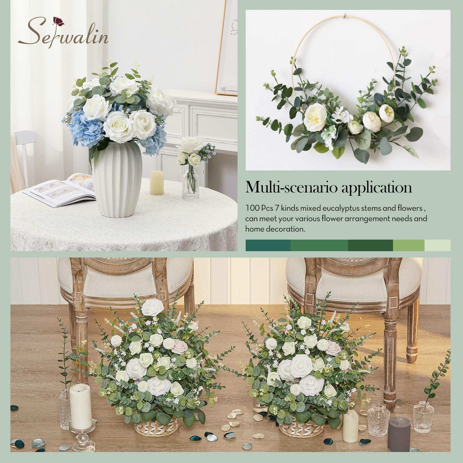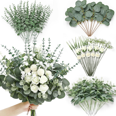 Serwalin 100 Pcs 7 Kinds Mixed Artificial Eucalyptus Leaves Stems with Flowers