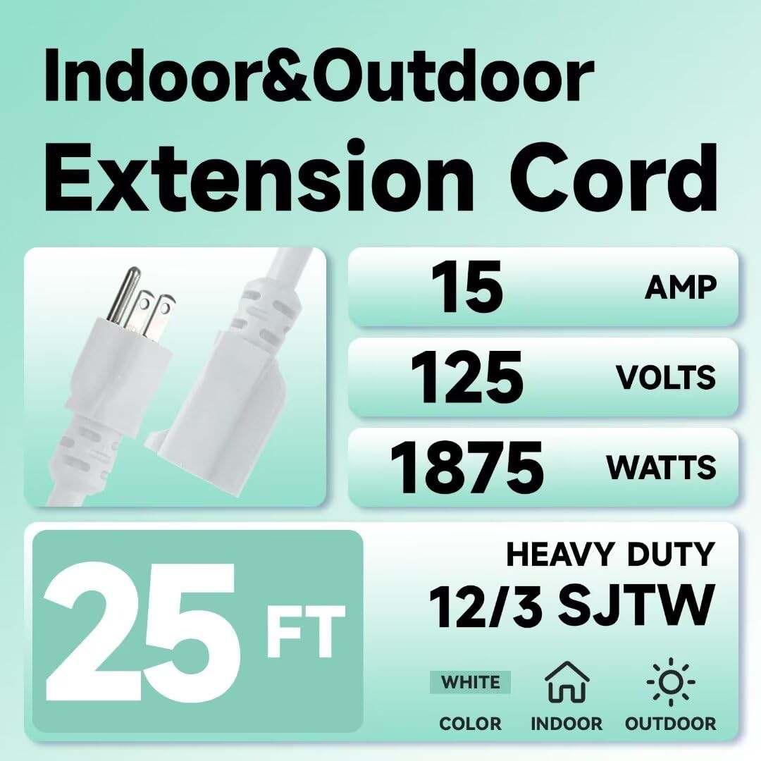 FNXPOW 25ft 12-Gauge Outdoor/Indoor Extension Cord 3-Prong 15A 125V 1875W