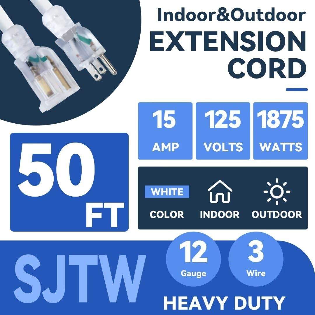 FNXPOW 50ft 12 Gauge 3-Prong Indoor/Outdoor Extension Cord Heavy Duty