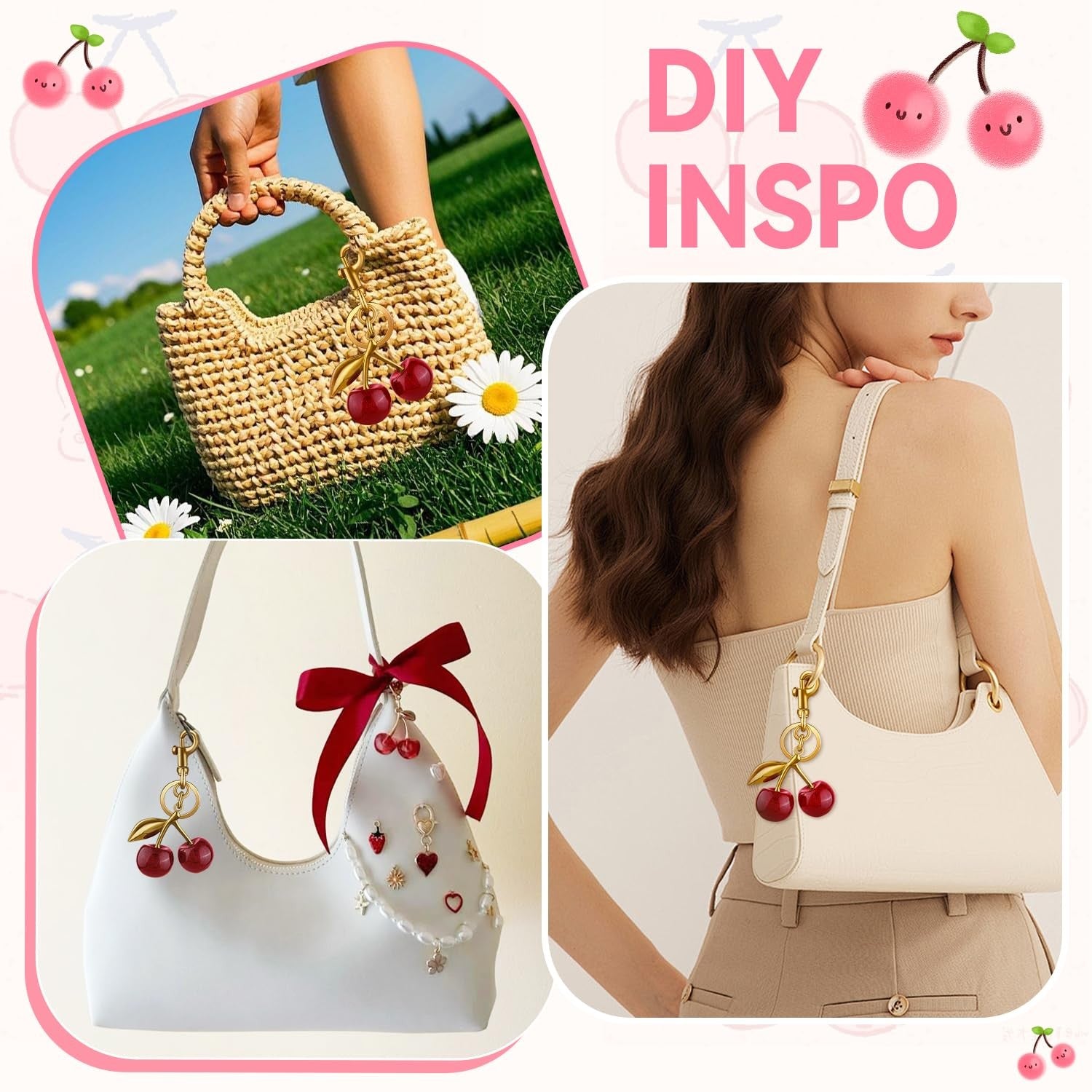 TINKRSTUFF Cherry Bag Charm, Glitter Purse Keychain, Gold Cute Accessory