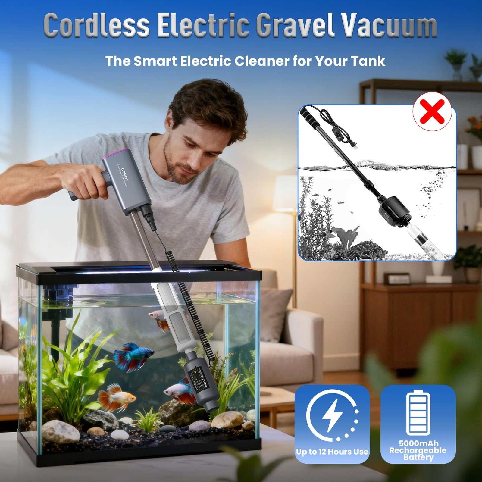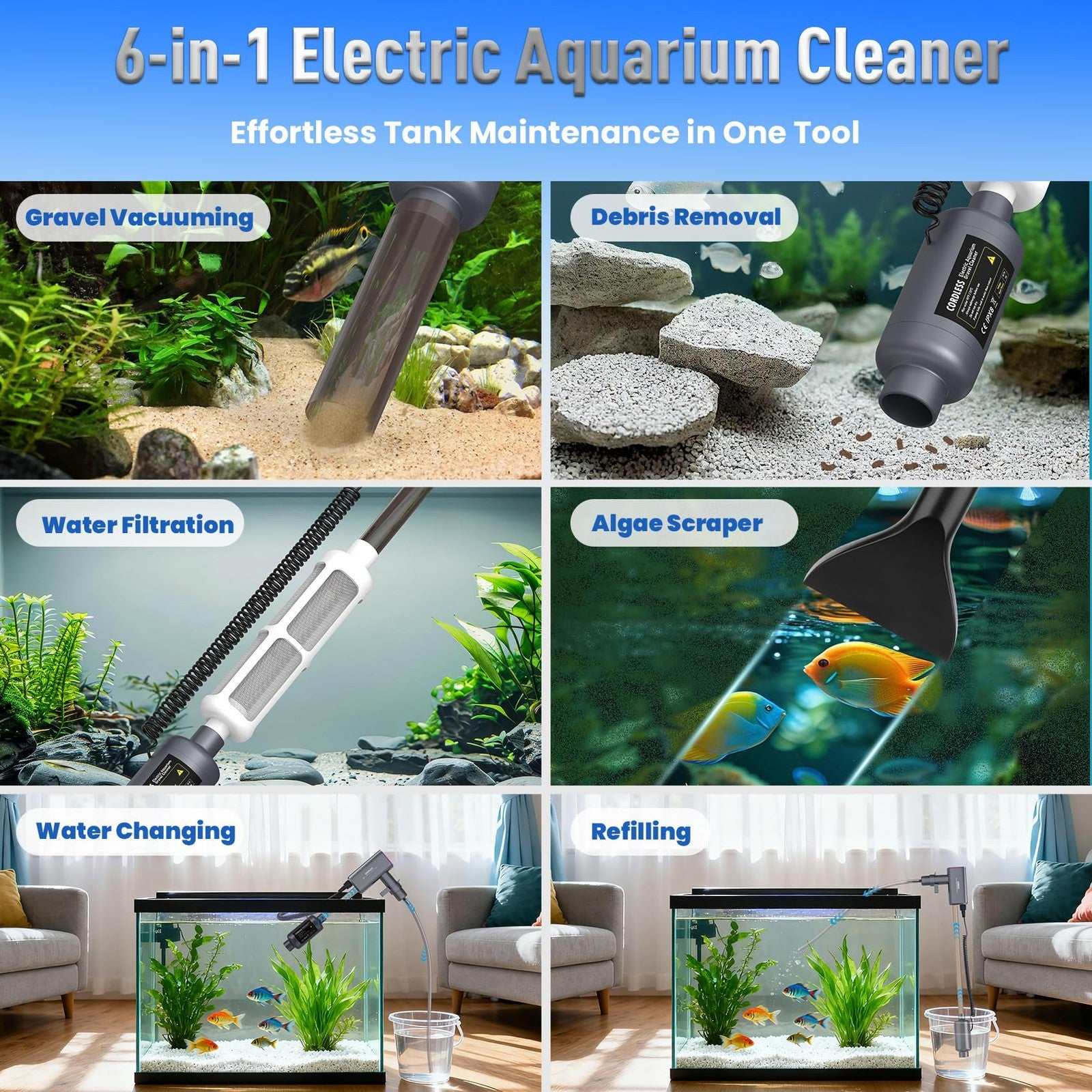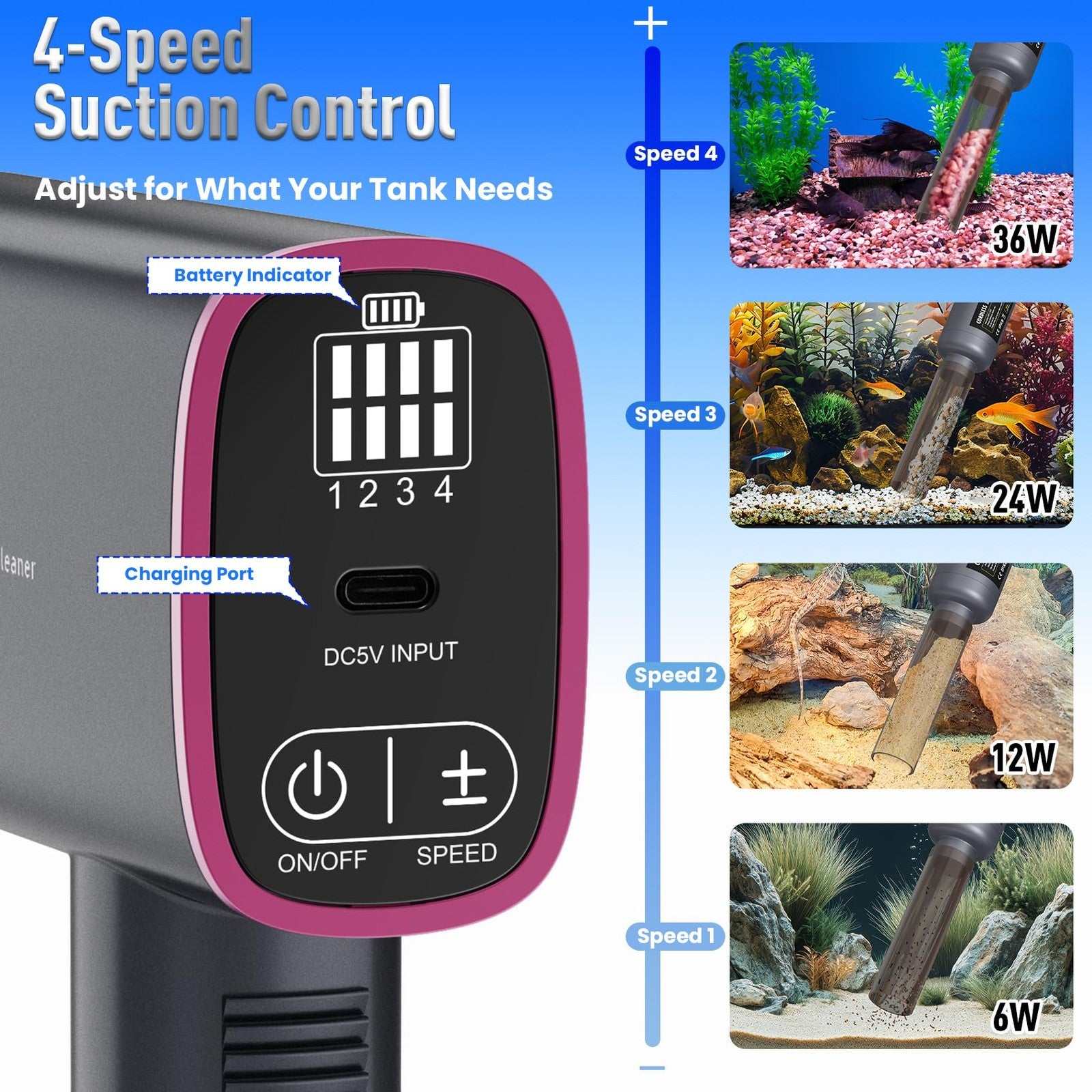Rechargeable Electric Aquarium Gravel Cleaner 4 Adjustable Suction Fish Tank Wat