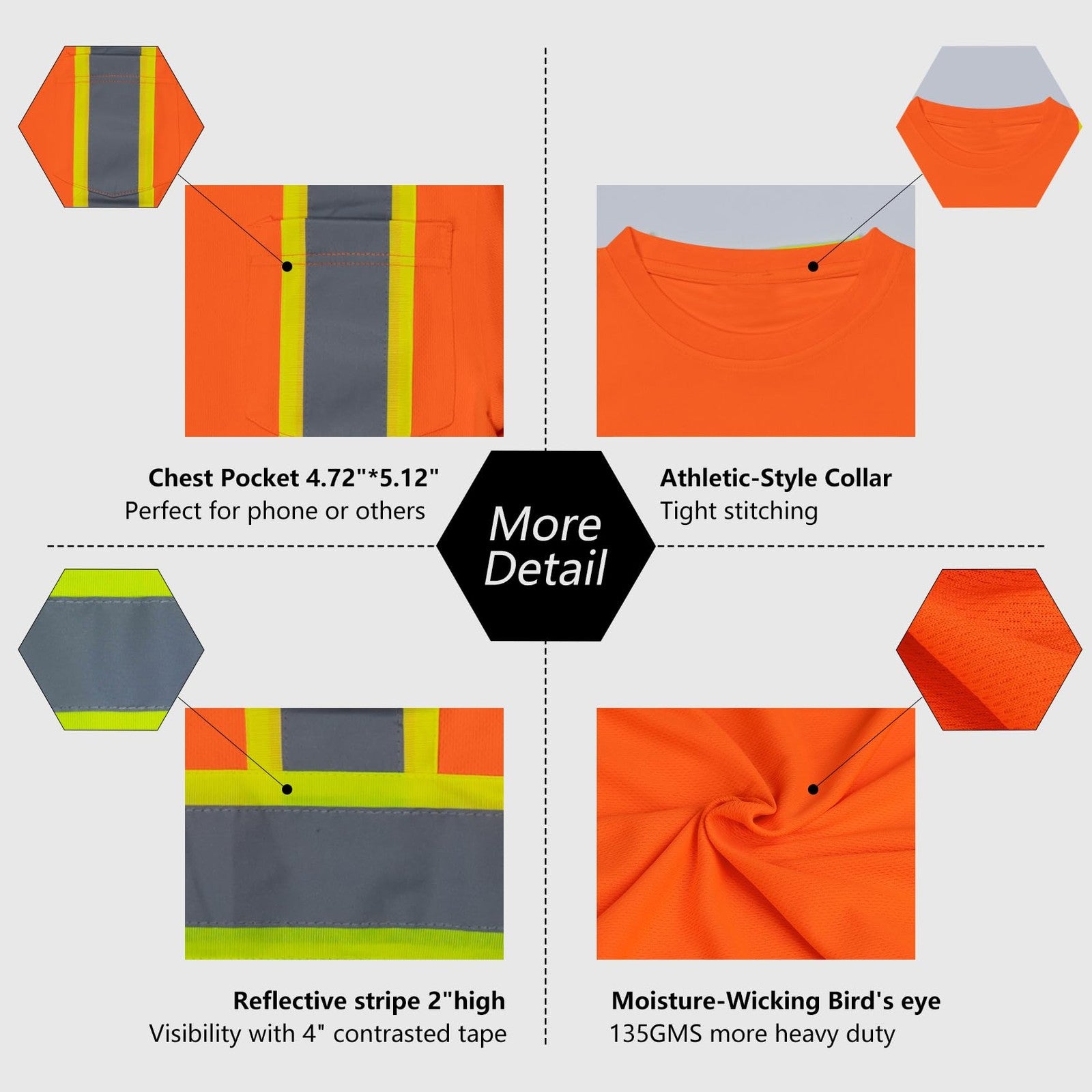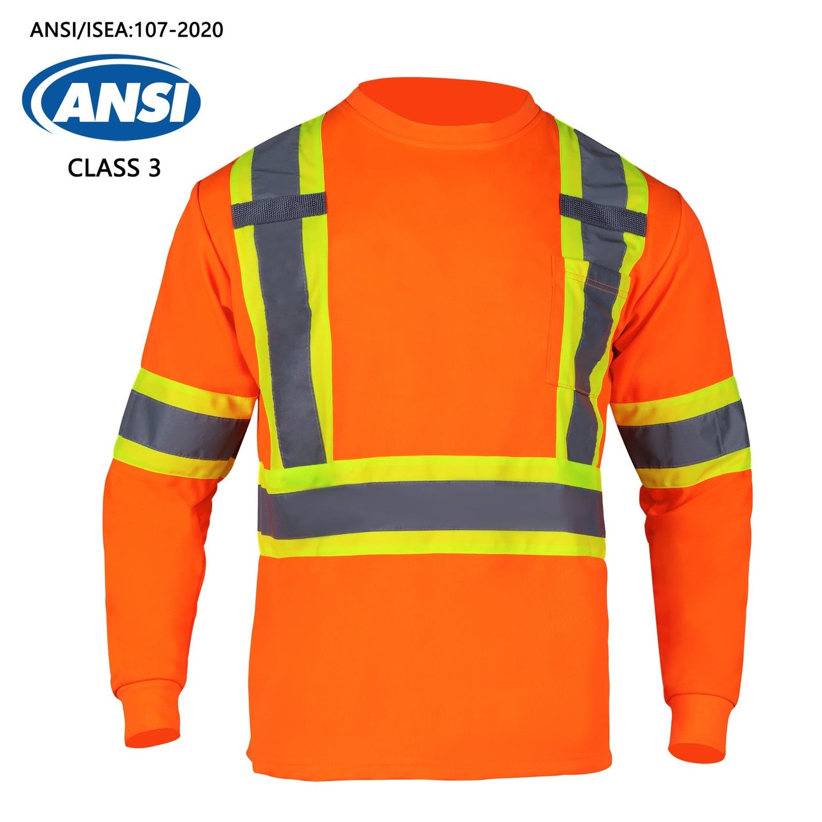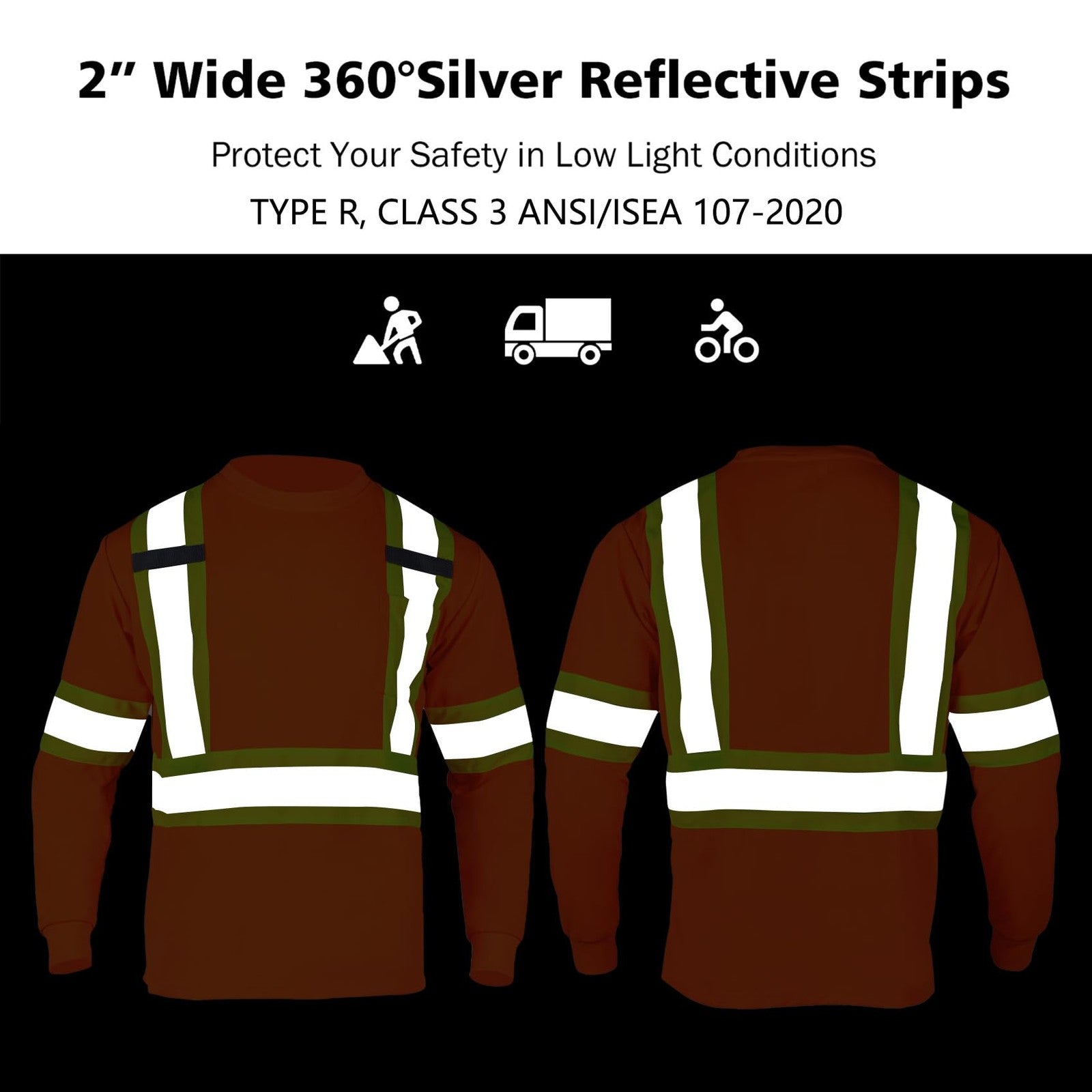 MATERIAL: The safety shirt is constructed with comfortable fluorescent bird eye knit fabric for a drier, cooler moisture wicking experience.,HIGH VISIBILITY:Safety shirts long sleeve in Black,Lime Yellow,Neon Orange with reflective silver strips around the waist and each sleeve. That makes you be 360┬░visible when you are running or doing sports in dark. It will make you stand out in the crowds.A pocket on left comes handy when needed.,COMPLIANCE & SAFETY:This reflective shirt is in full compliance with ANSI/ISEA 107-2020 Class 3/Level 3 for all occupations and available in SIZE Small Medium,Large,XL,2XL,3XL,4XL,5X-Large,hi vis long sleeve shirts for men and women.,WIDE RANGE OF USING: The hi vis long sleeve shirt is for construction workers, survey crews, surveyors, contractors, emergency responders, EMS, engineer, forestry, firefighter, police, crossing guard, public safety, security, traffic and parking attendants. Or for recreational activities such as: cycling, hunting / hunter, running, volunteering, jogging, bike, bicycle, motorcycle, and volunteering.,QUALITY: Top class quality and construction ensures wearability, comfort, safety and wear and tear.Machine Wash with Cold Water.