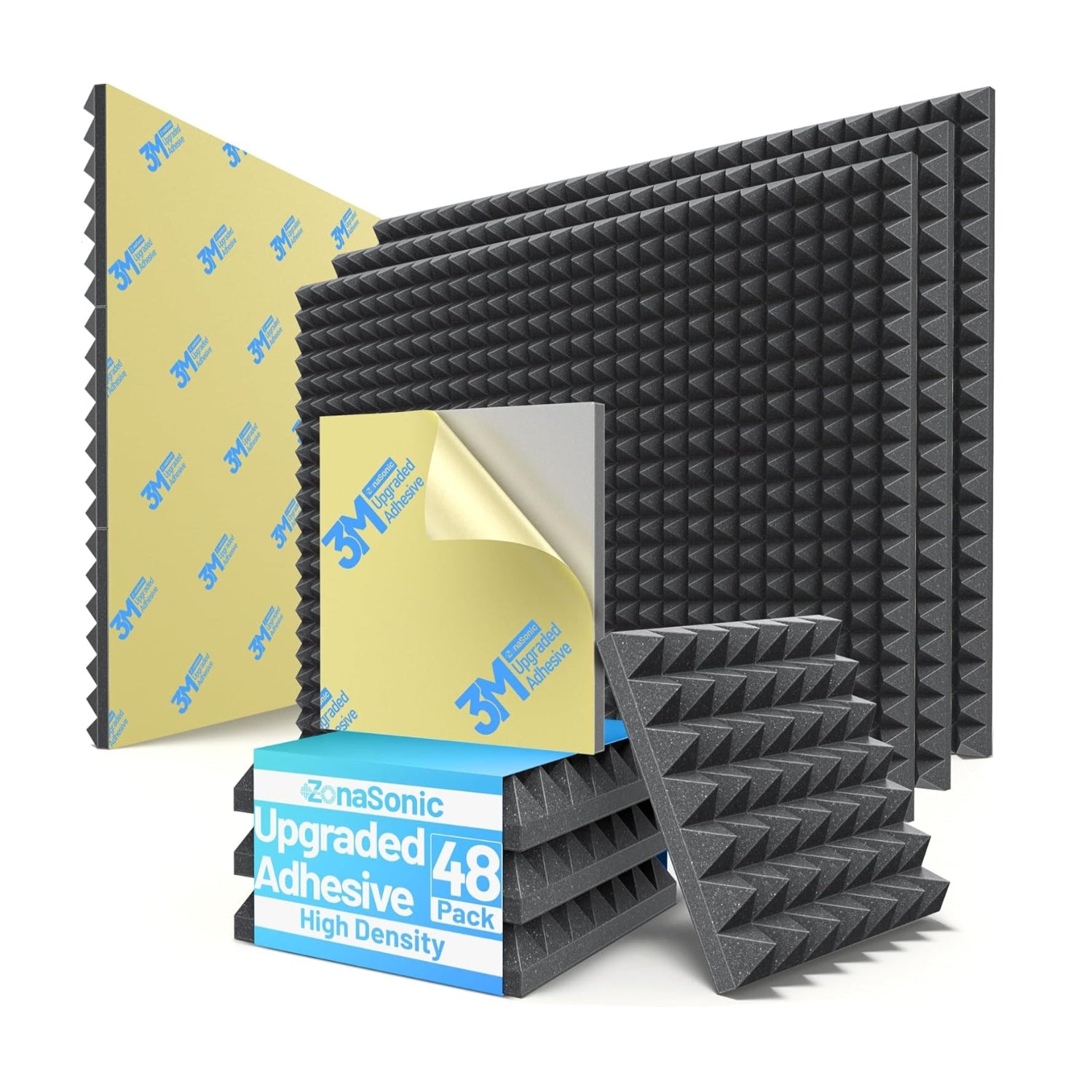 48 Pack Pyramid Sound Proof Foam Panels for Walls with Updated Self-Adhesive 2"X12"X12" High Density Acoustic Panels Sound Absorbing Fast-Expanding Soundproof Wall Panels for Gaming Studio Decor-Black