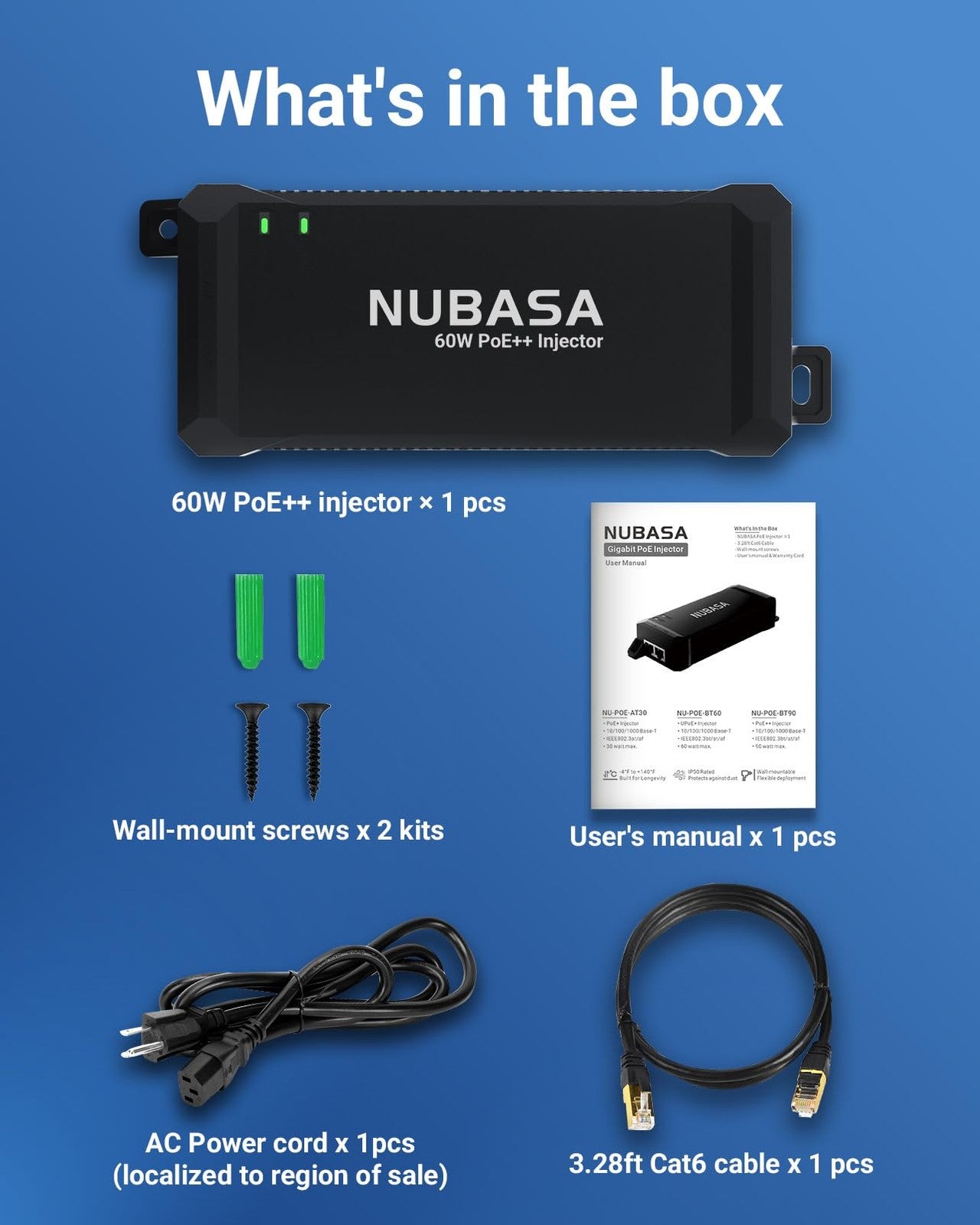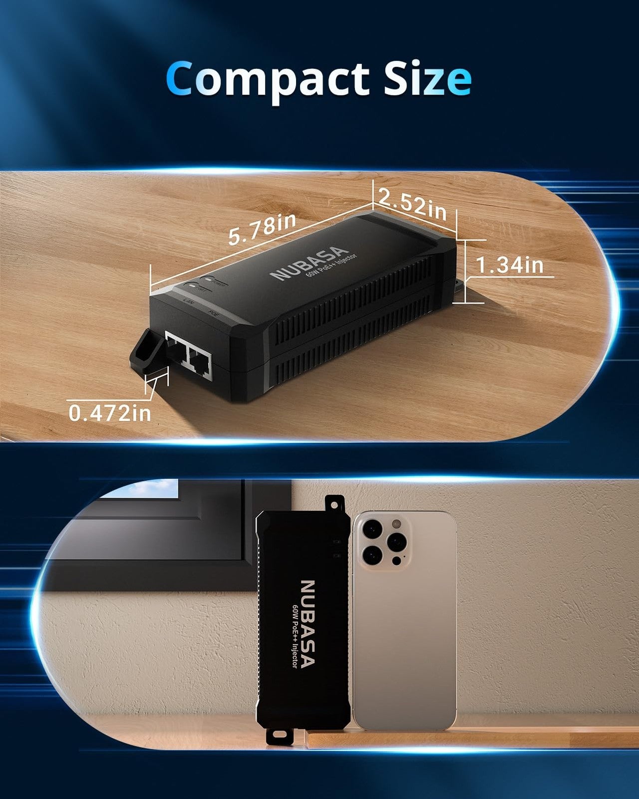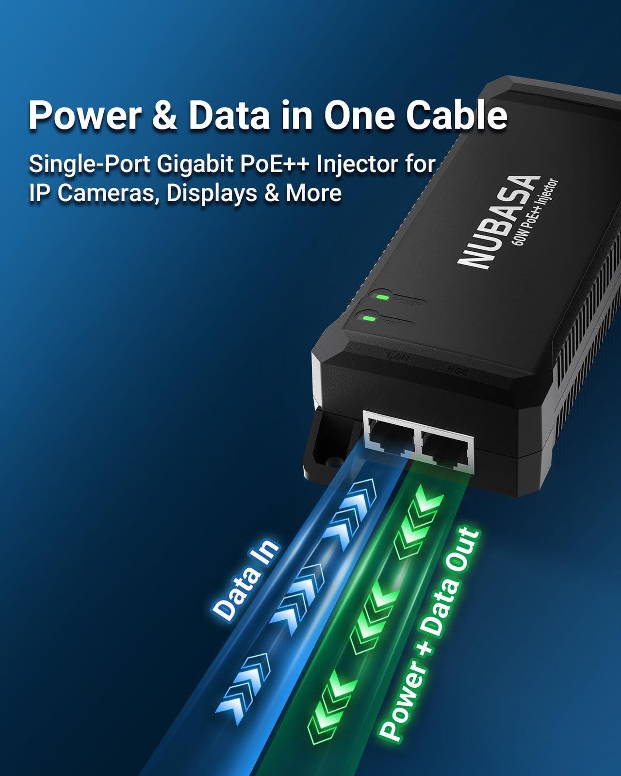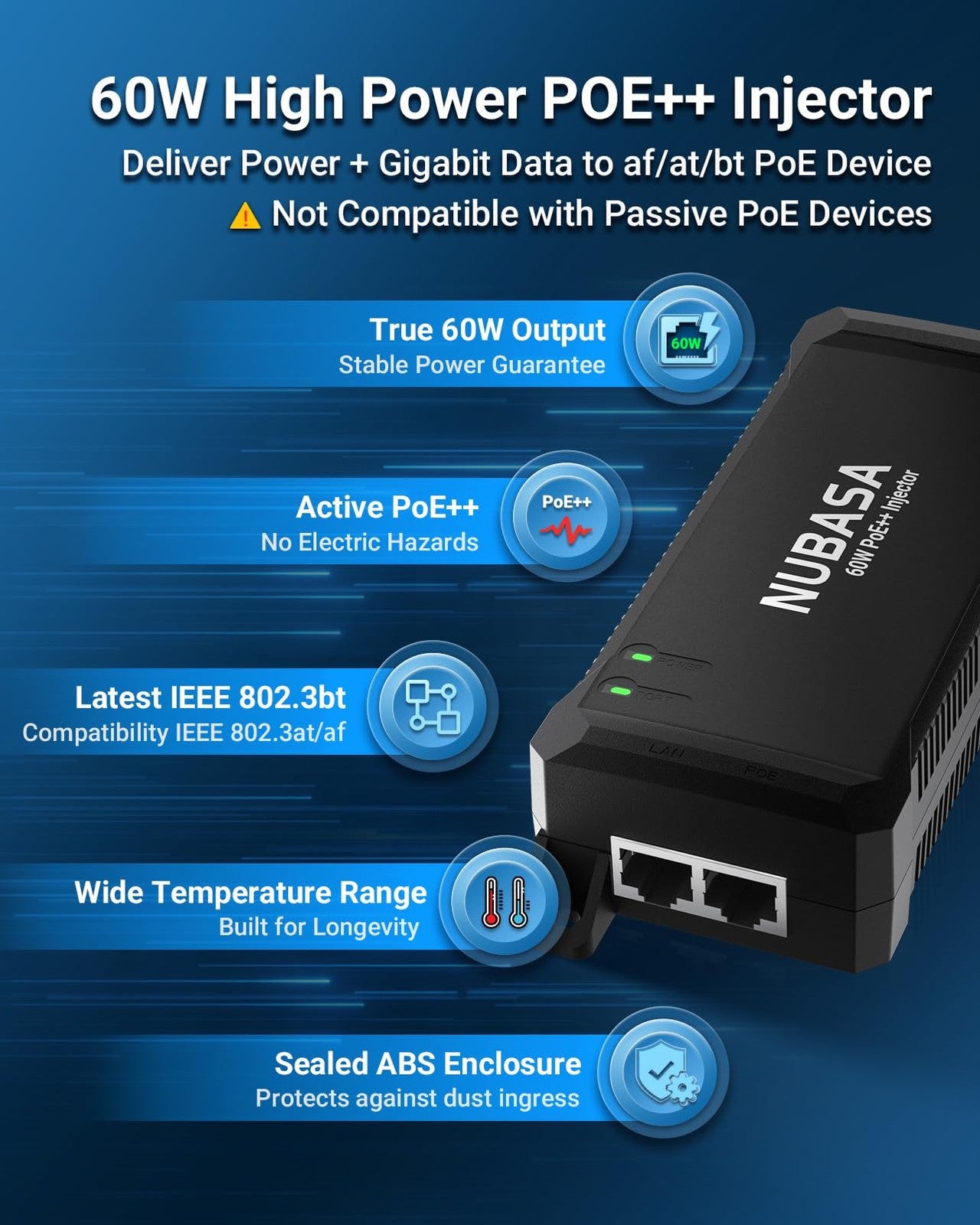 NUBASA 60W PoE++ Injector – IEEE 802.3bt Class 6 Gigabit Power Over Ethernet Ada