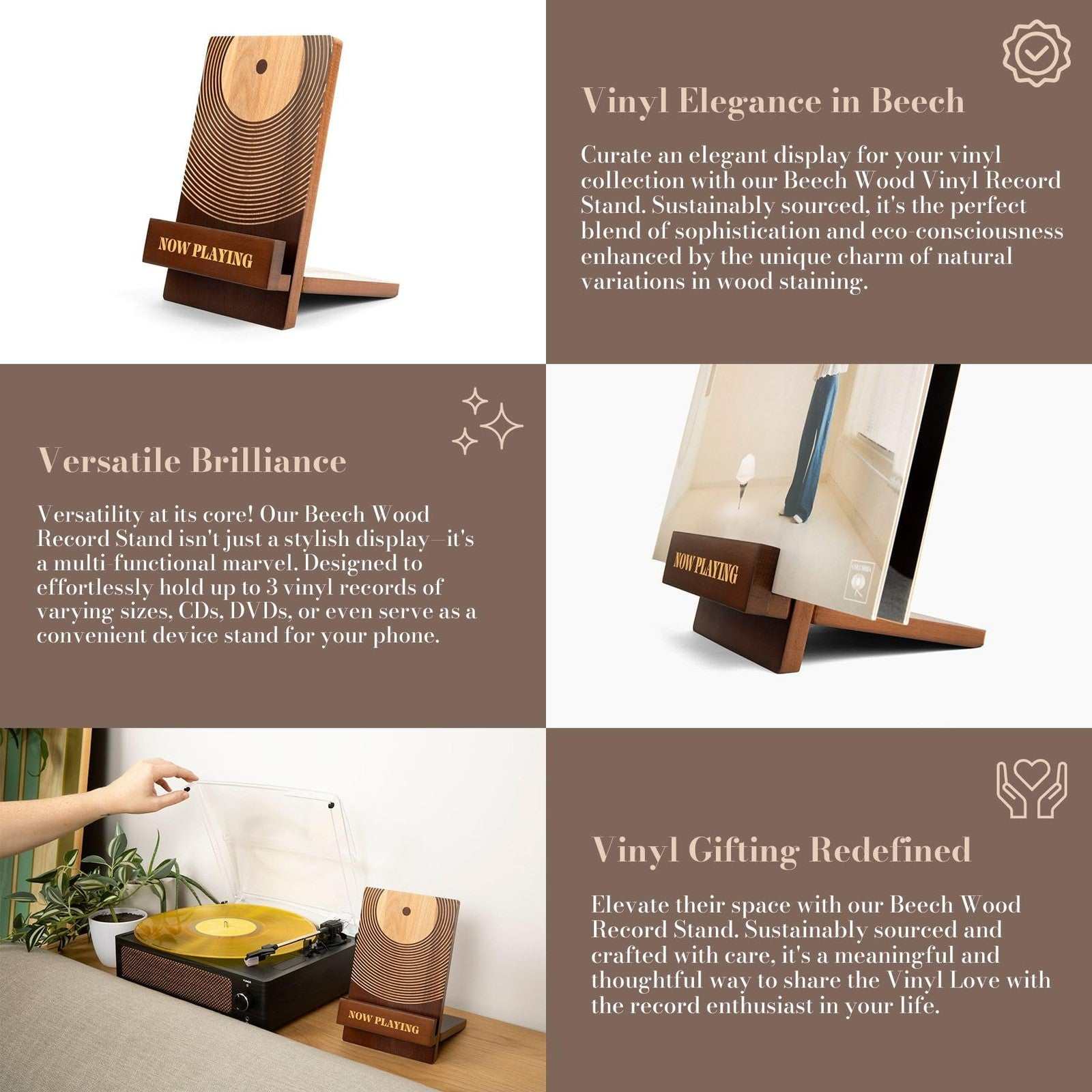 Sonny & Sloane Now Playing Vinyl Record Stand - Classic Brown Wood Holder