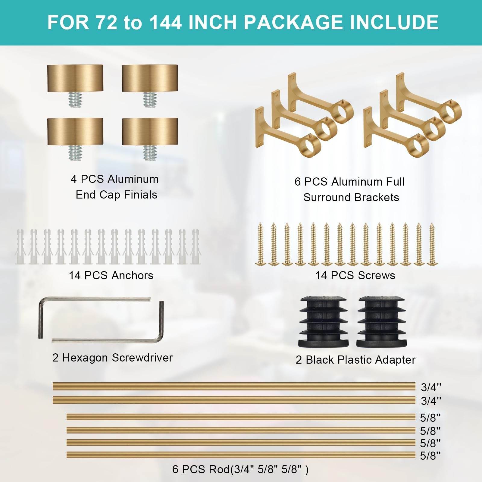 2-Pack Curtain Rods 72-144" Adjustable Aluminum Finials Full Surround - Lwiiom